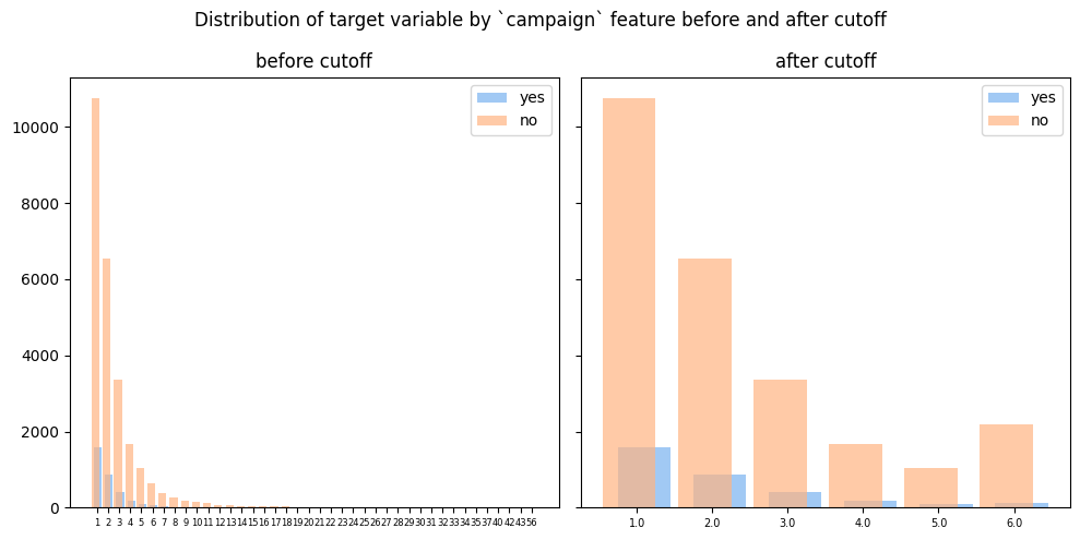 fig.suptitle('Distribution of target variable by `campaign` feature before and after cutoff')