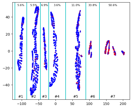 On this picture we can clearly see several clusters with different density of red (positive) dots. Let’s evaluate the probability of getting positive outcome in each cluster