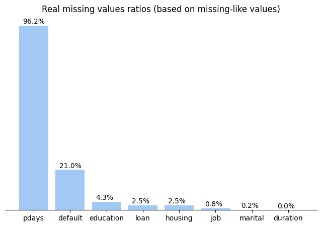ax.set_title('Real missing values ratios (based on missing-like values)')