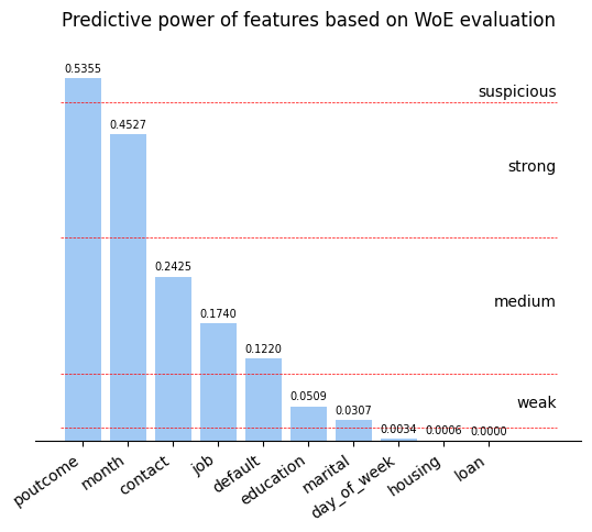 To understand predictive power of features in dataset I will use Weight-of-Evidence (WoE) approach. It also will help me to get rid of nan-like values by providing numeric values to replace nans with.