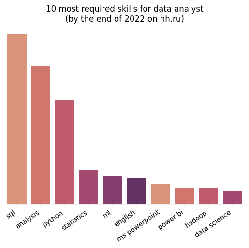 ax.set_title('10 most required skills for data analyst\n(by the end of 2022 on hh.ru)')