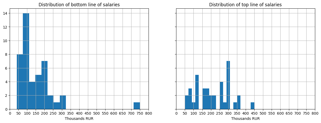 axs[0].set_title('Distribution of bottom line of salaries')